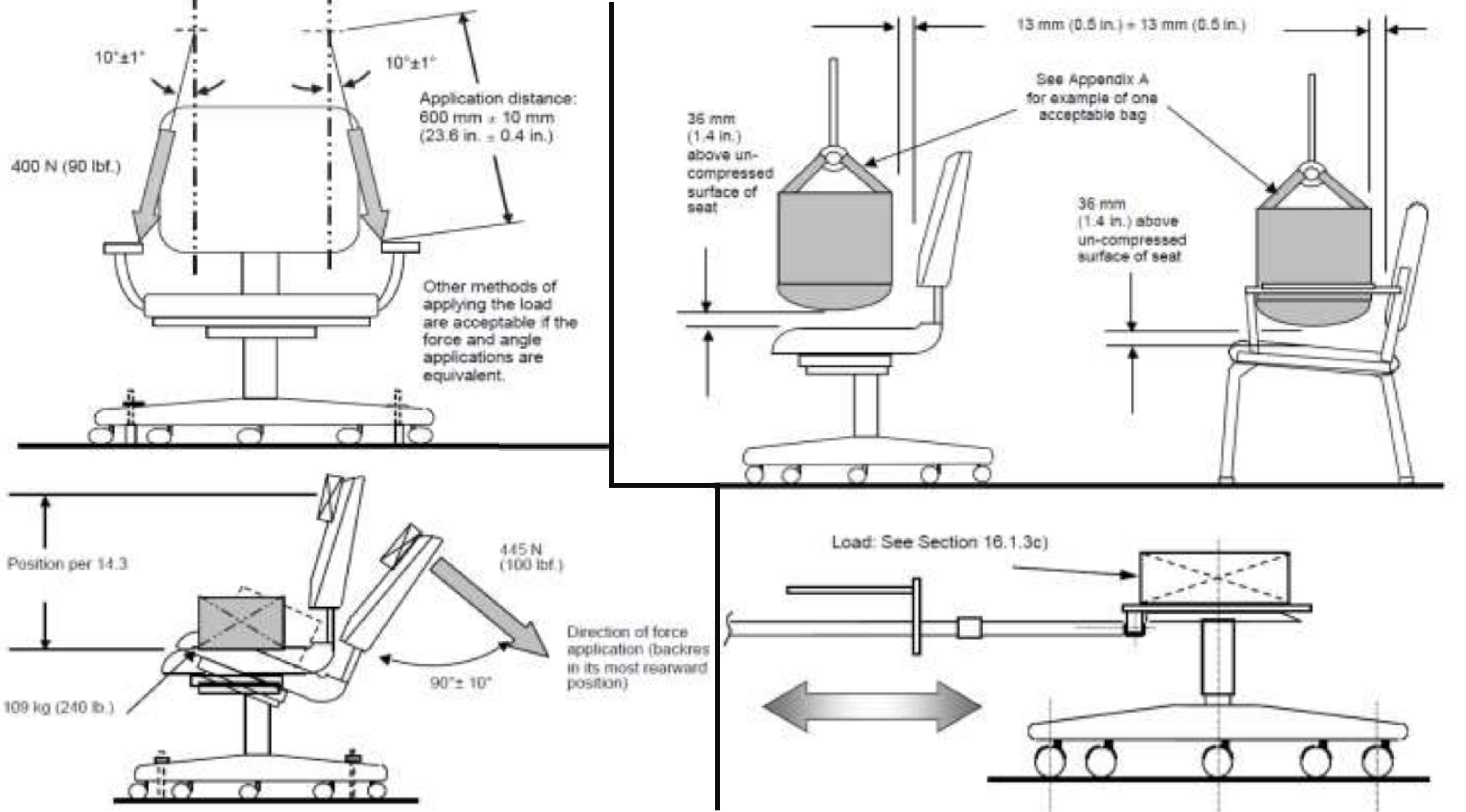 Place 109 kg (240 lb) in the center of the seat and apply a 445 N (100 lb) force to the specified position on the backrest at a rate of 10 to 30 cycles per minute. If the width of the back rest of the chair at the load height position is less than or equal to 406 mm (16 inches), perform 120,000 cycles. If the width of the back of the chair at the load height position is greater than 406 mm (16 inches), after 80,000 cycles, maintain the above load height, move the load to the right 102 mm (4 in) position of the back-to-back vertical center line to perform 20,000 cycles, and then move the load to the left side of the back-to-back vertical center line to perform 20,000 cycles. After the test is complete, the chair cannot lose function.