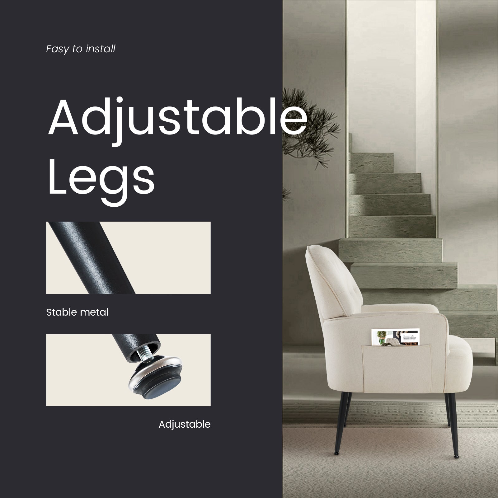 Le fauteuil d'appoint rembourré est soutenu par quatre pieds en métal. Les pieds réglables de la base assurent son équilibre et sa stabilité, avec une capacité de poids maximale de 350 livres. Les pieds en métal robustes et les patins antidérapants vous permettent de rester en équilibre et stable, tout en protégeant votre sol de l'usure et des rayures. Par conséquent, cette chaise longue sera un ajout durable à votre espace de vie.