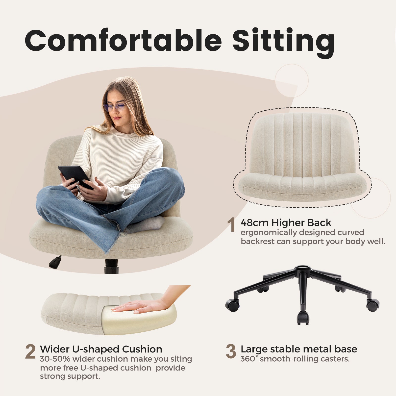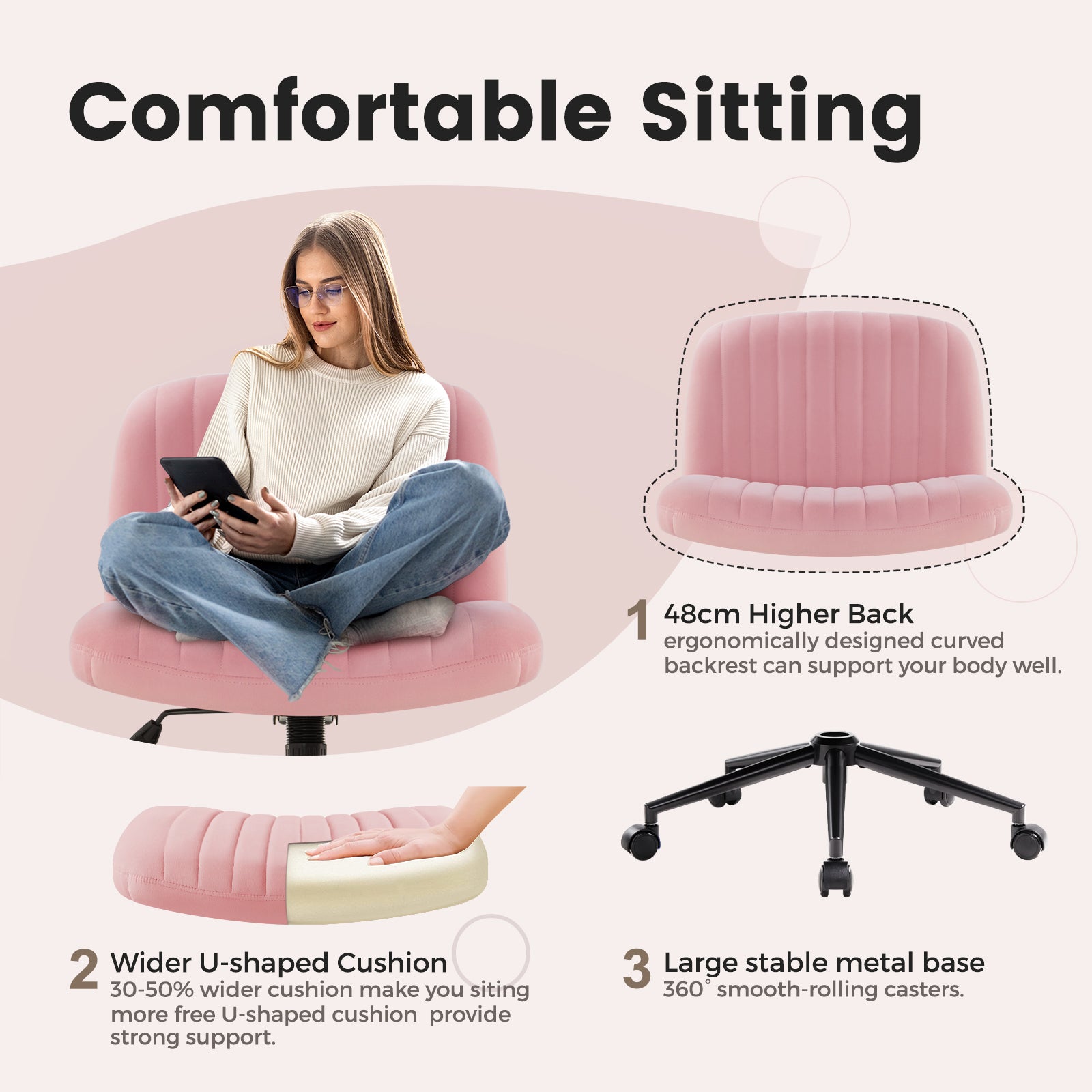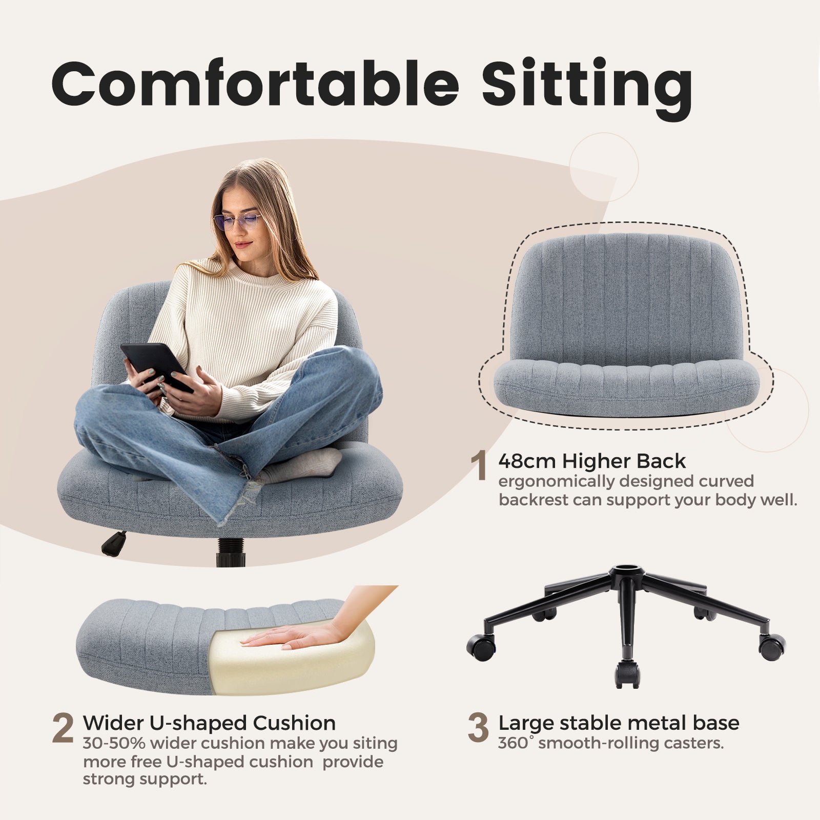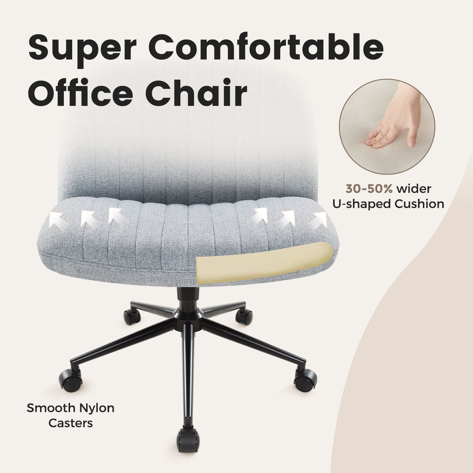 - Soft and Wide Seat: The wider and higher seat and backrest allow you to sit comfortably on the chair with crossed legs; it is filled with highly elastic sponge with a density of ≥30 kg/m³, which has excellent elasticity; the surface of the cushion is covered with comfortable fabric, which is soft, skin-friendly and breathable; and under the wide cushion is the super stable pentagonal frame, which is Day Day Comfort offers.